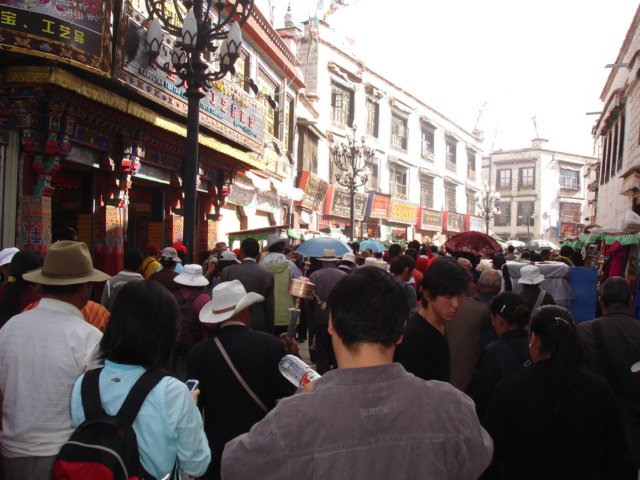 Prayer flags wrapped about a post in front of the Temple