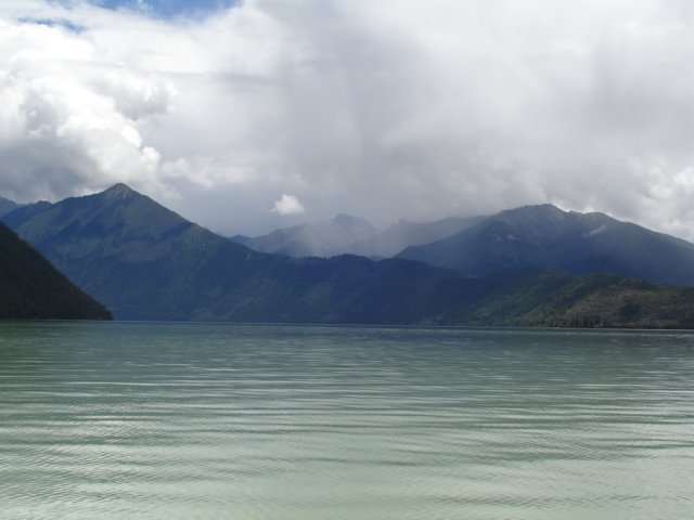 Crossing the lake to a waterfall