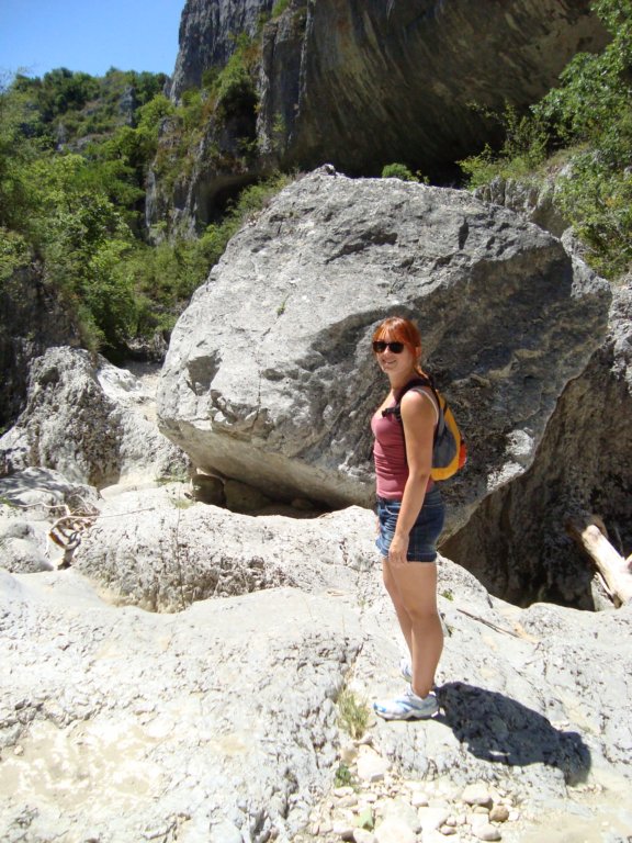 Christine climbing down