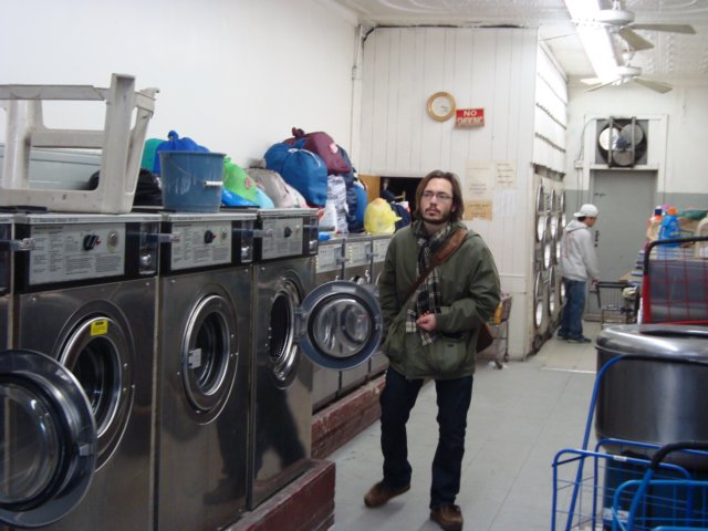 Laundry travels to the laundromat in the American Dream rolling cart (the bent axle of which I repaired: the Dream repaired) and requires a fistfuls of quarters to wash.