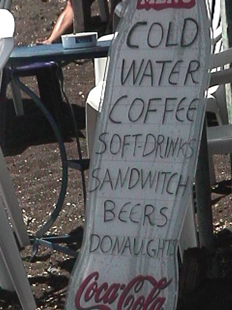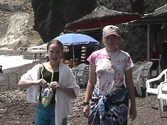 Next to the ruins at Akrotiri we trekked over the rugged coast to the Red Beach where we got our first taste of swimming in the Mediterranean. This expedition was a lot of fun. There was the whole scene with Dominique needing to borrow a bathing suit and Nikki relinquishing hers, then there was the bit where Christine bottomed out coming in from a swim. The best part though was the signage for the snack bar!