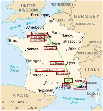 On Good Friday (2 days before Easter Sunday), we left the Vaucluse and headed North. Trace our route by following the red rectangles from south to North. By Saturday April 22, we were in Mariel Marly. The photos on pages for Chartres and Colombes were taken on Monday April 24, our final day in France.