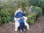 | Our last stop was in the town of Mendocino. Here Brigitte is modeling one of the beautiful ceramic chairs in the garden of the ceramic artists boutique where we go each year