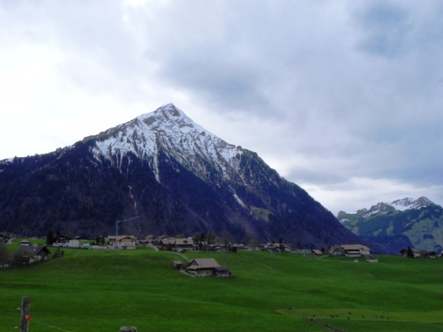 A slowly darkening sky over green pastures and very well-groomed Wanderwege
