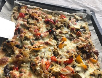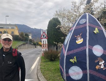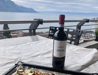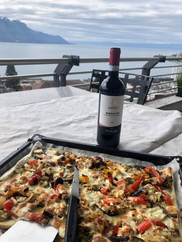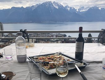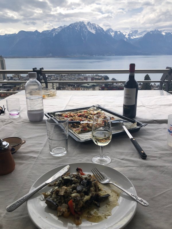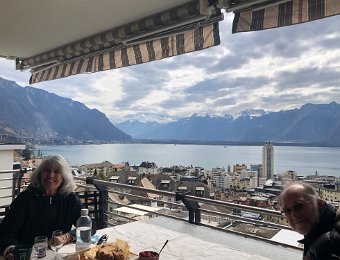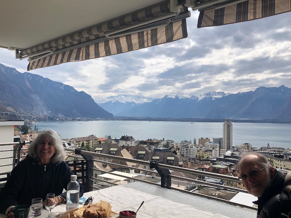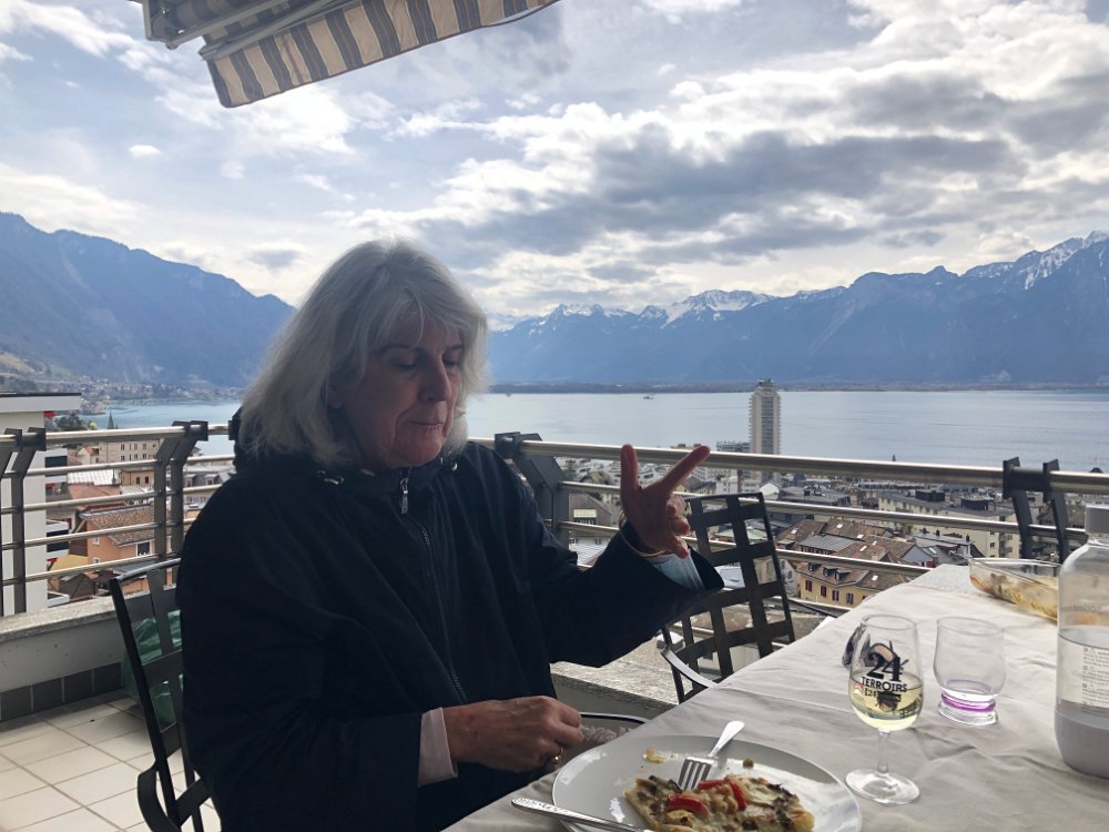 10 April Walk to Vevey Pizza on Balcony with Robin