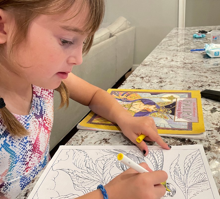 A little coloring in a book brought over from Montreux while waiting for the muffins to bake
