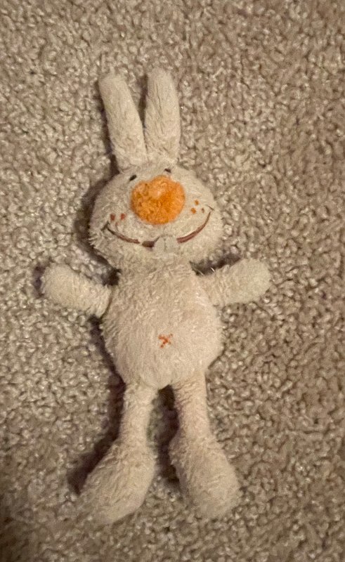 This is the original bunny that came with a shirt and overalls inside a cloth book. His clothes and the other parts that were part of the book are... somewhere other than on or with him