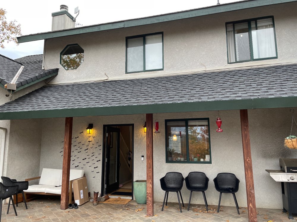Entrance. Hexagonal window in the stairs is a nice touch