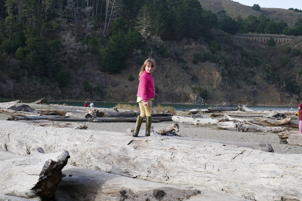 Big balance beams strewn across the beach