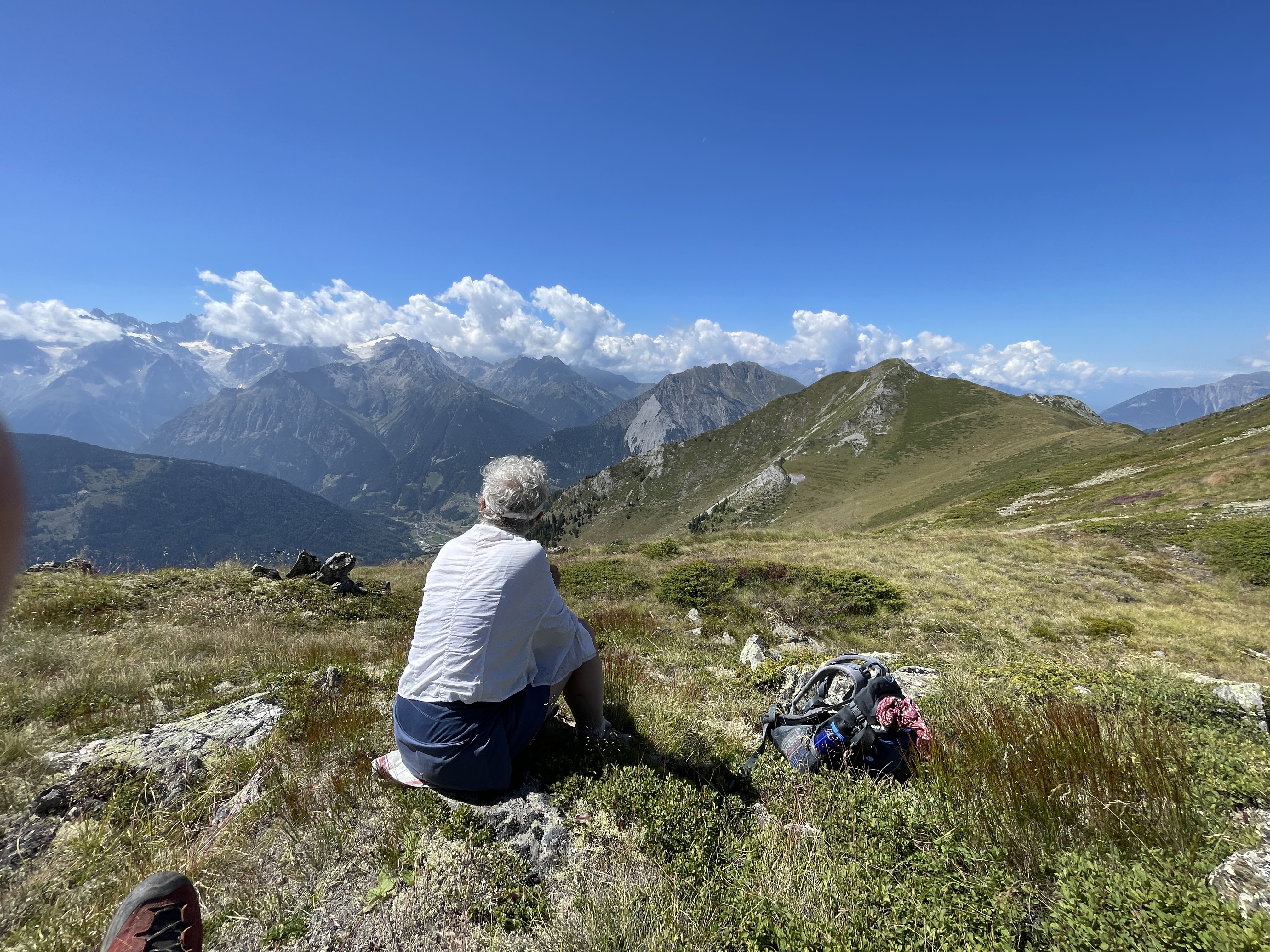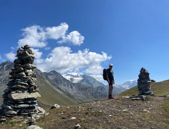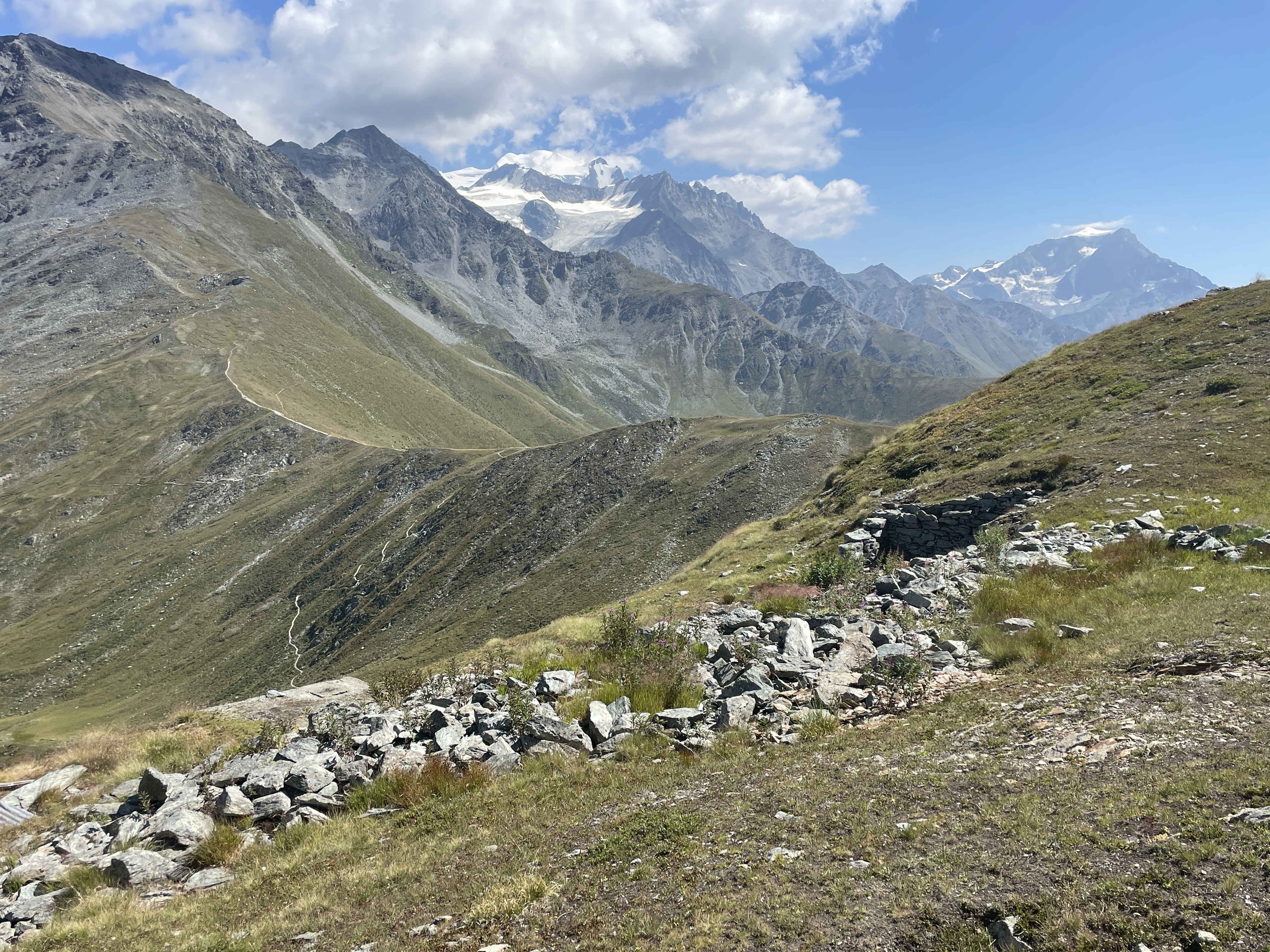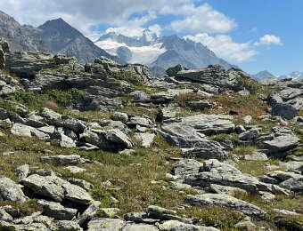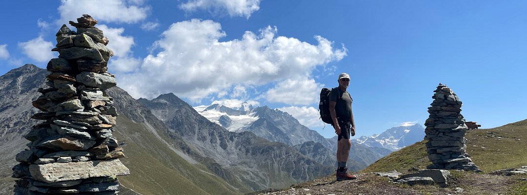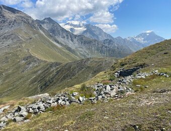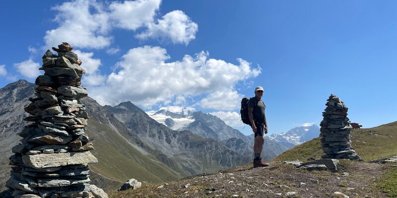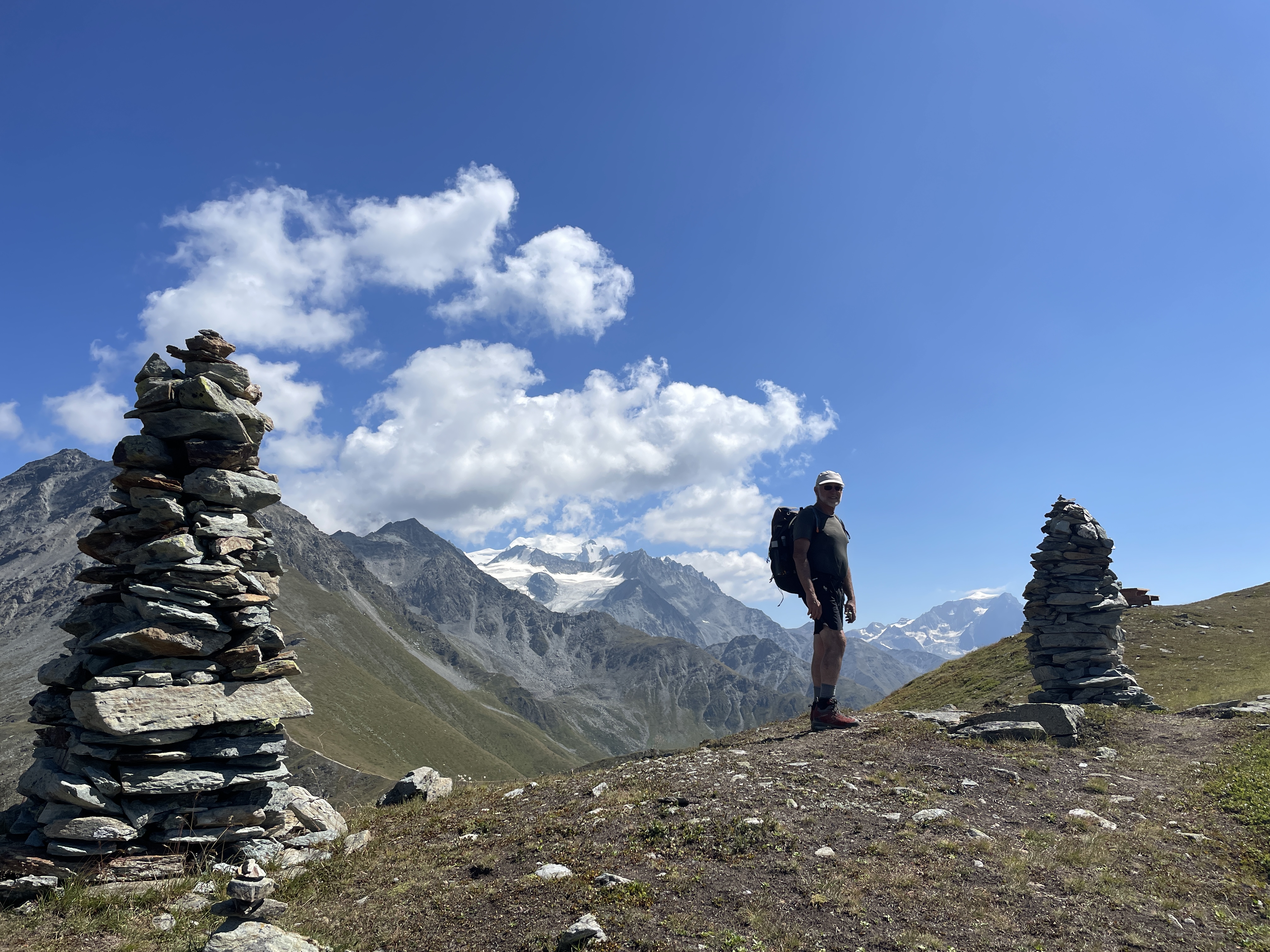 Grand Combin (L) and Mt. Vélan (r) with cairns and picnic table