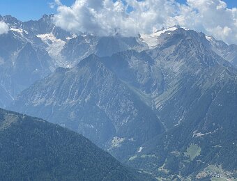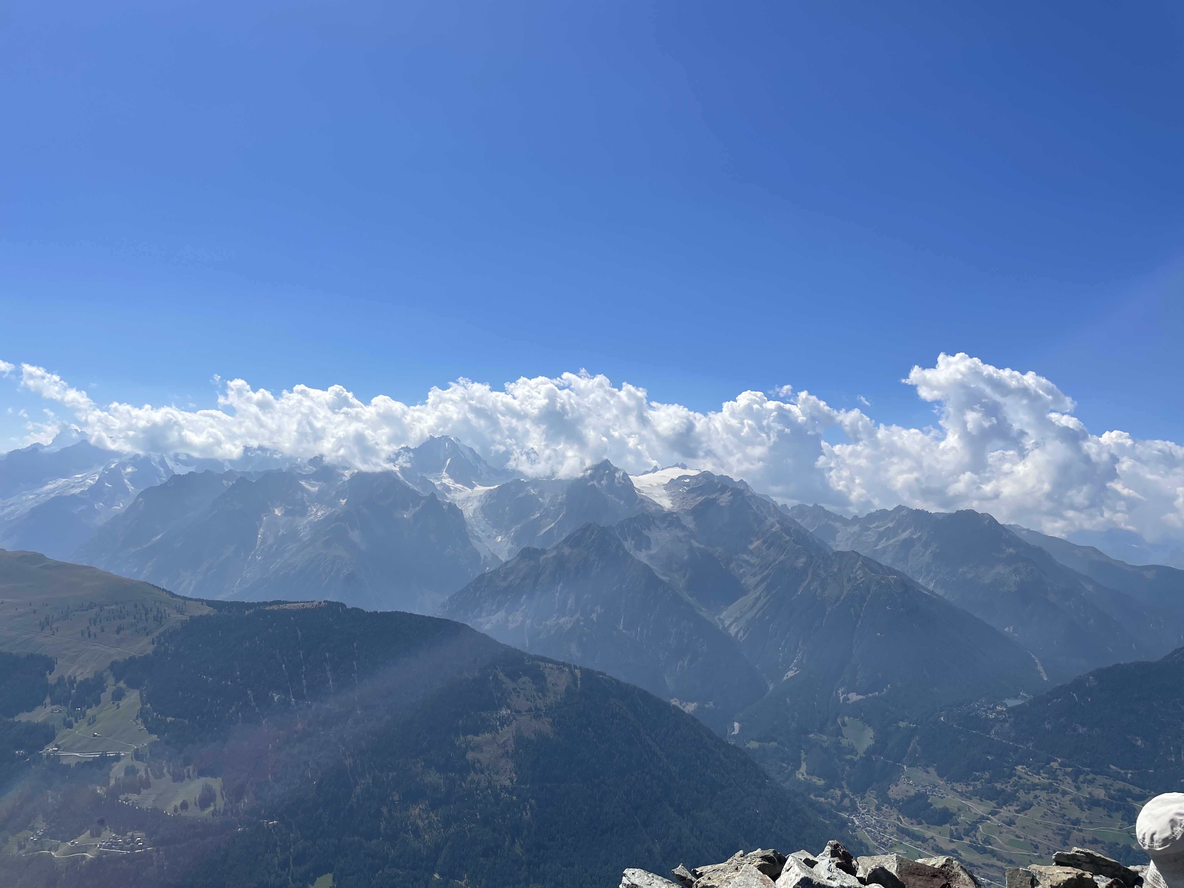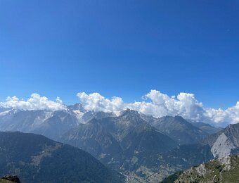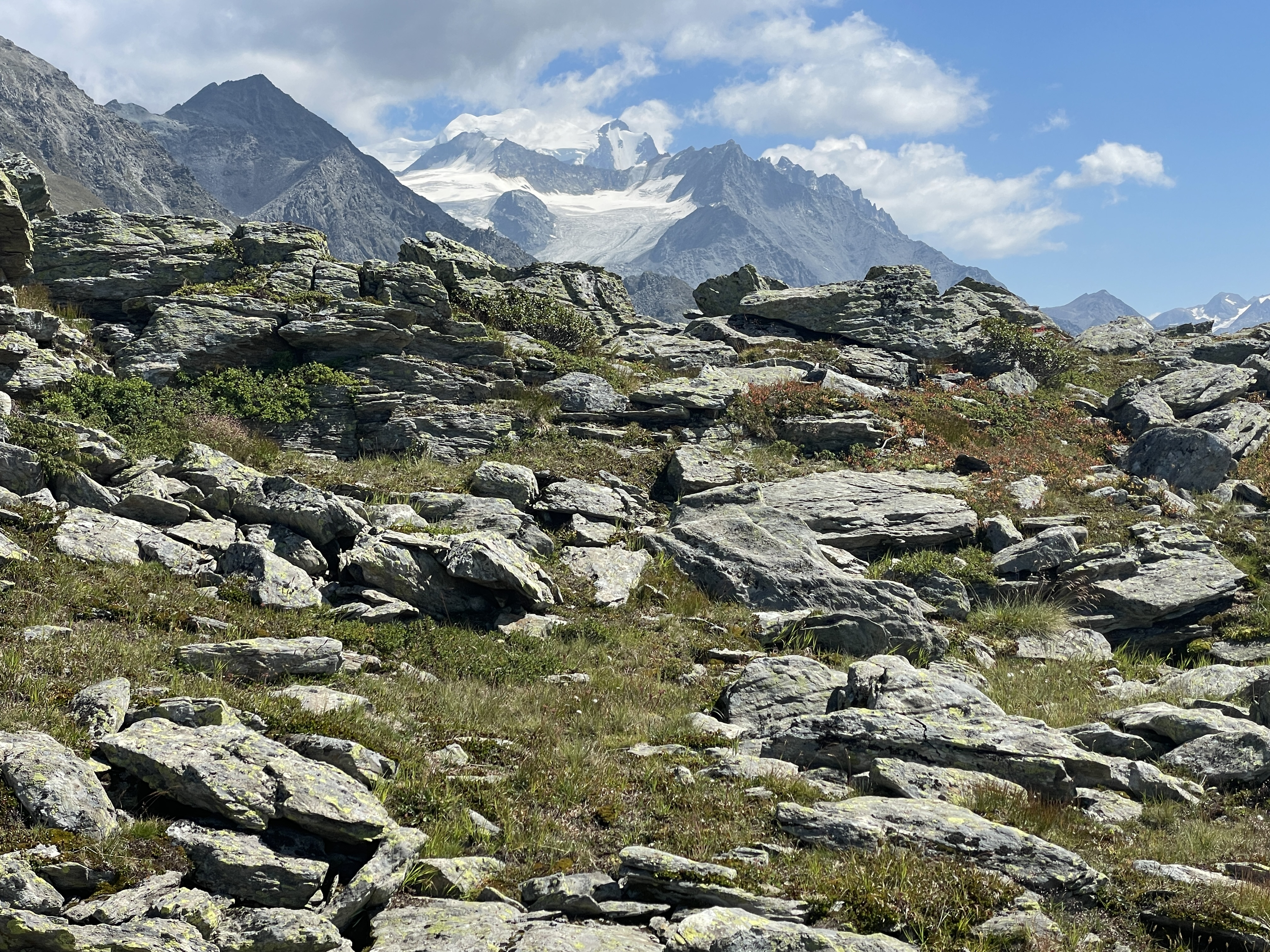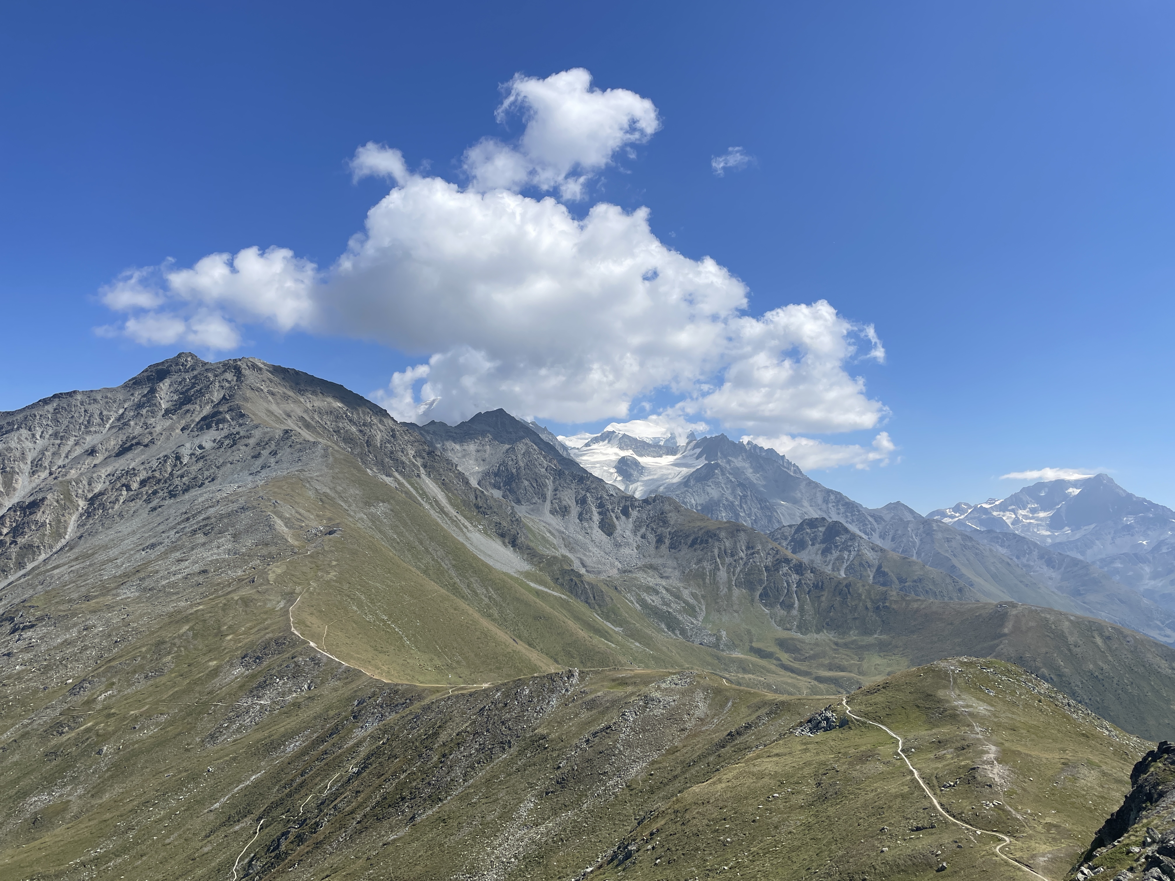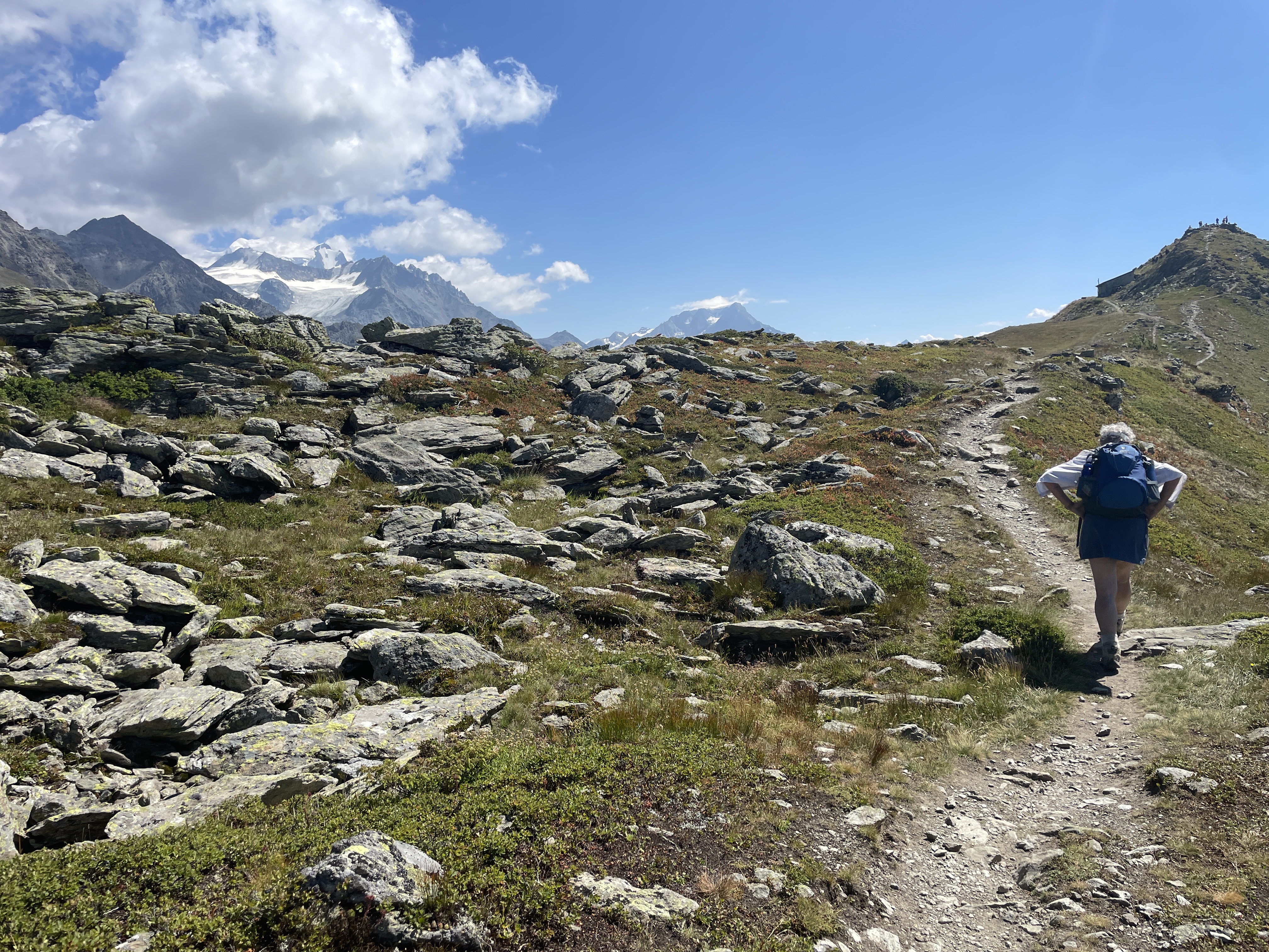 Grand Combin (L) and Mt. Vélan (r) with cairns and picnic table