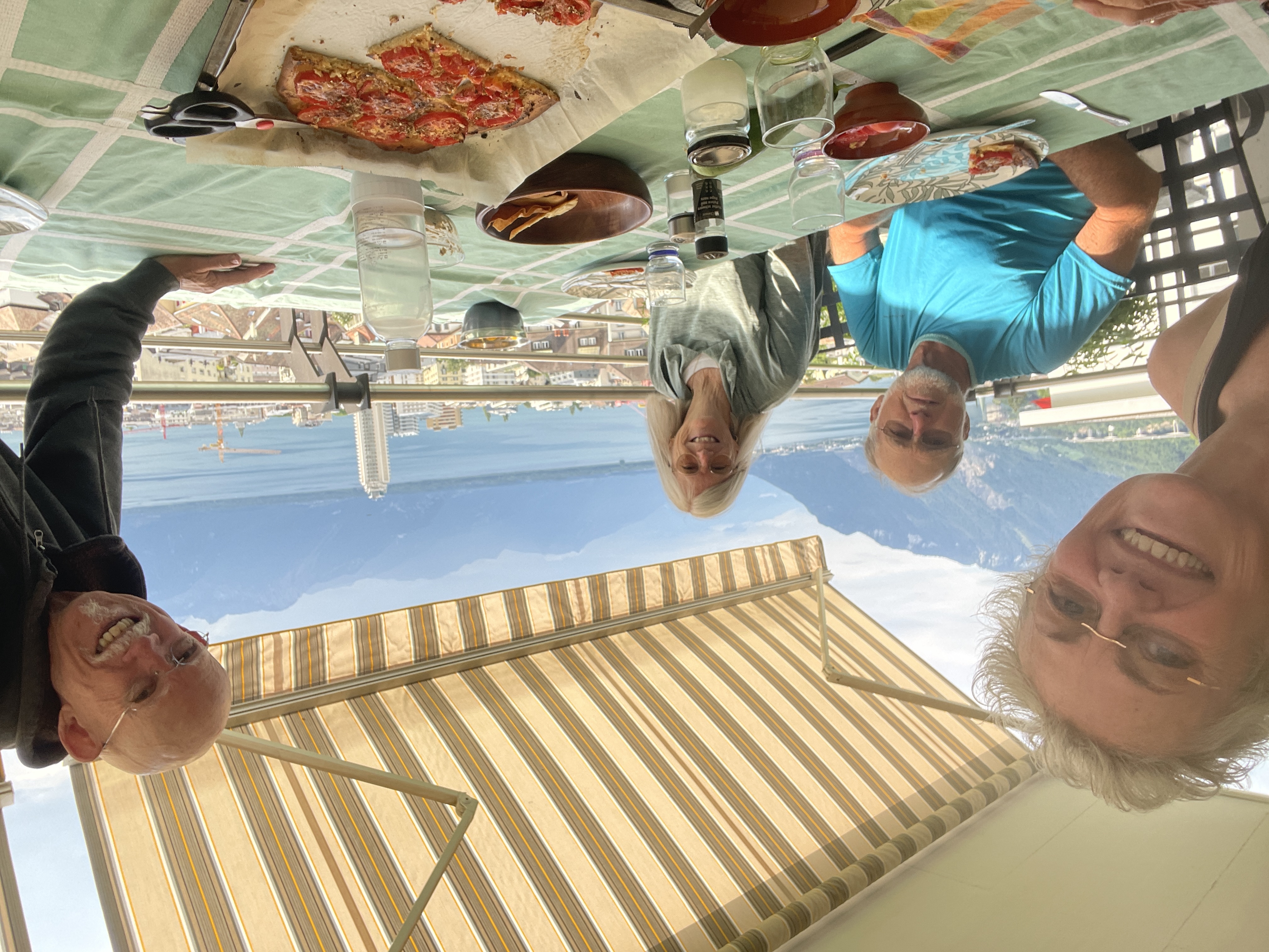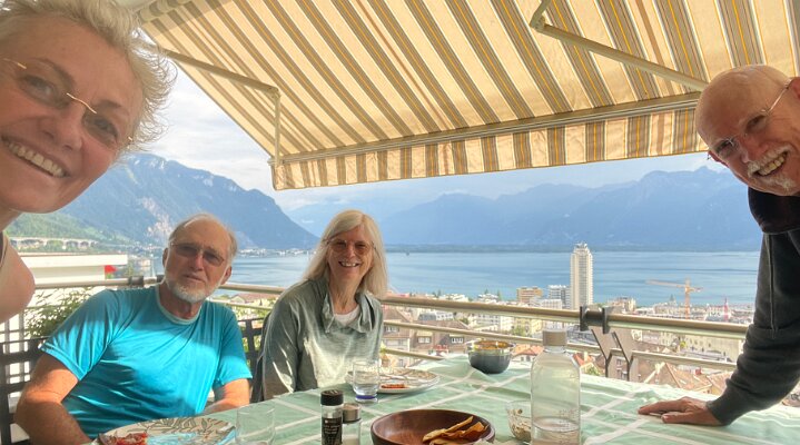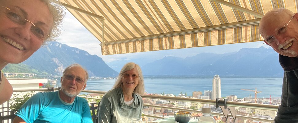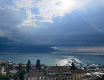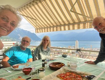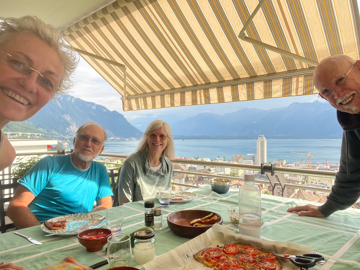 Dramatic skies on July 26 Jim and Marilyn are back! Sunday morning we head over to Peter and Cory's in Serge's truck and pick up AC units 25 July - Vufflens-le-Chateau and Lully for Lunch at Susan and FredyGarden in July
