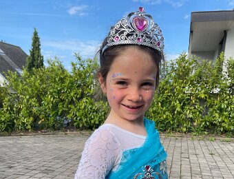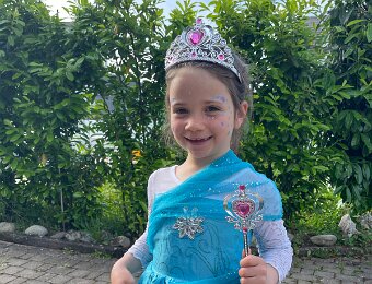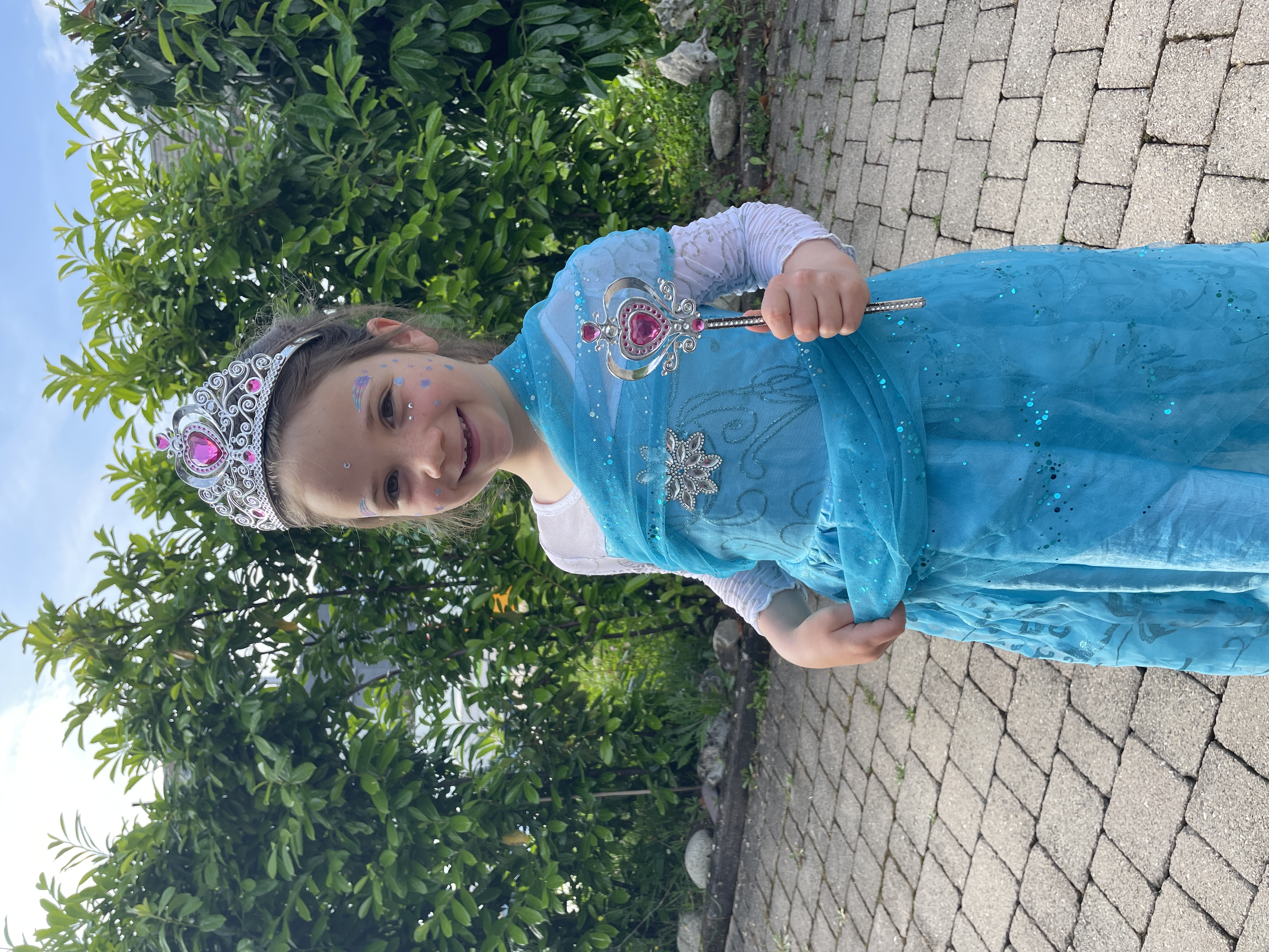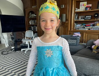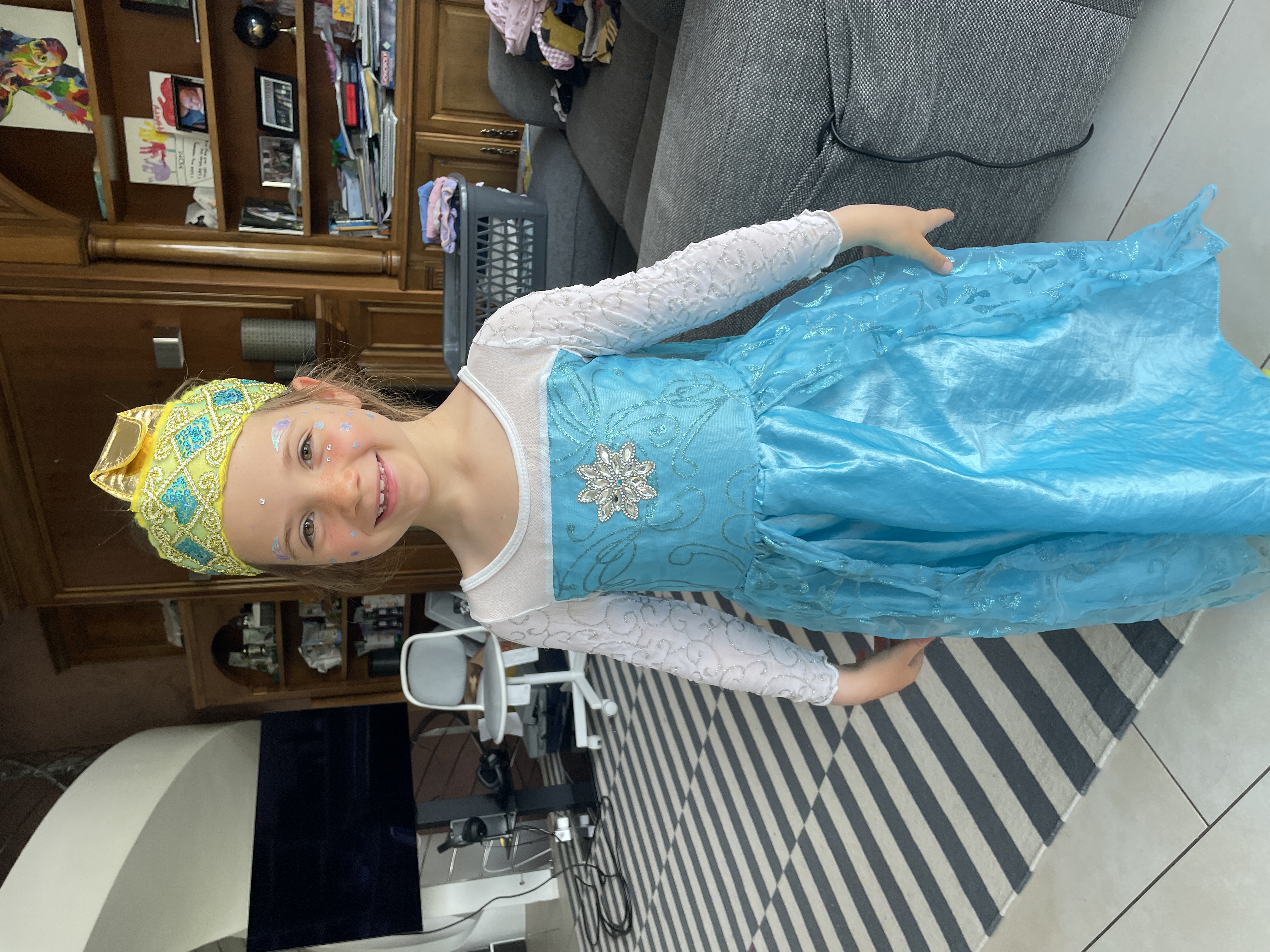 In her costume (though she really didn't think the Frozen theme was cool)