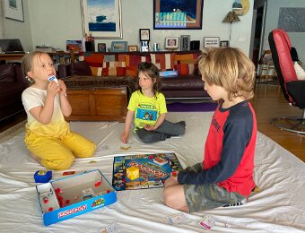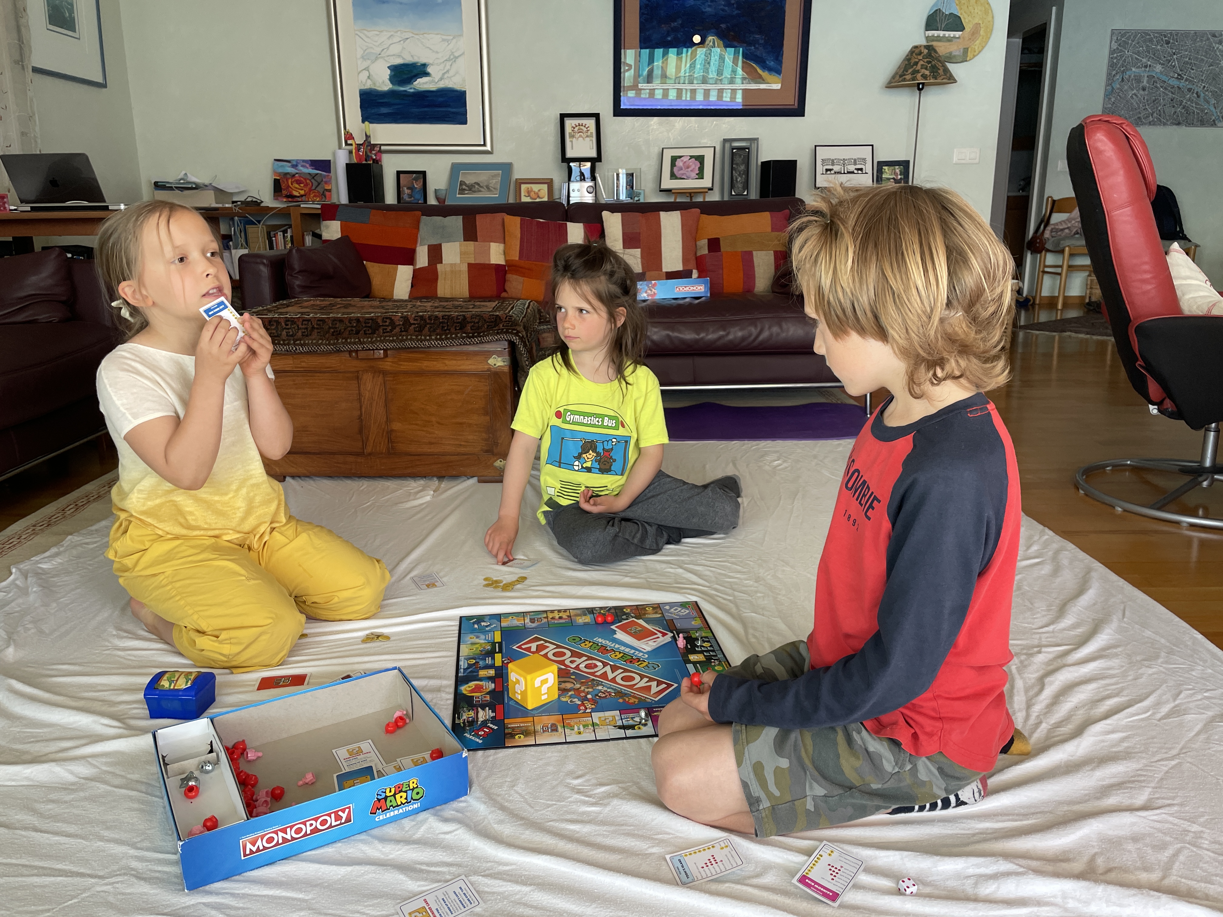 Pack of kids playing Super Mario Brothers Monopoly