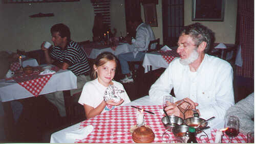 | Brigitte at the end of the table could barely stay in her seat. But we caught her there long enough to take these photos. Francis, Claire and Greg are smiling. | The doggie bag was artfully shaped into a swan. |
