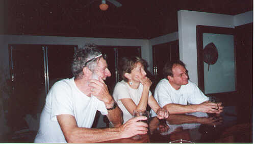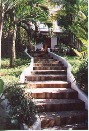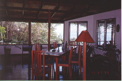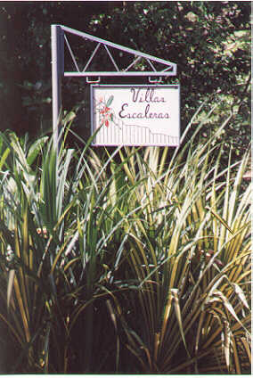 | This sign, hung by the road, told us we had finally arrived at Villas Escalaras. | These are the steps from the parking area up to the house. | Inside, the place was well furnished and there were windows on all sides. This is the communal living room/dining room where we ate dinner each night. | There was also a bar at which we could sit and listen to Michael (the owner) tell us his experience building and running this facility. |