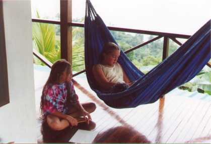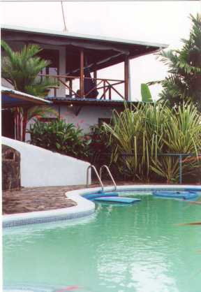 | Christine and Brigitte | Brigitte and Vivianne relaxing on the porch at Villas Escalaras. | The pool at Villas Escalaras with the house above. |