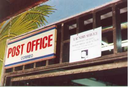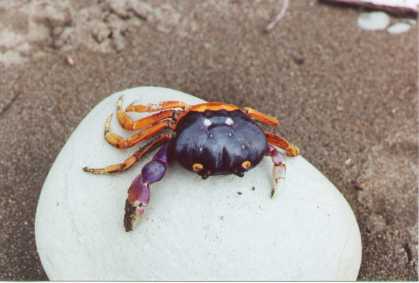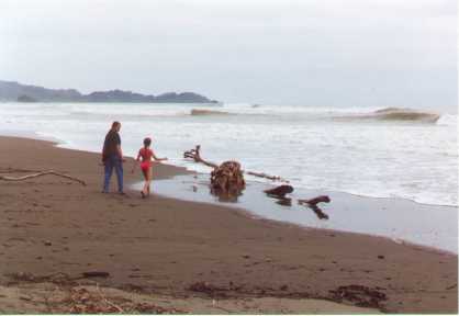 | On the road to Dominical | Nikki and Brigitte walking along the beach. There were surfers in droves, but we chose to stay out of the water. | This colorful crab was dead, but still photogenic | This place really caught our imagination. It was a bar, restaurant, post office and they offered laundry service as well! |
